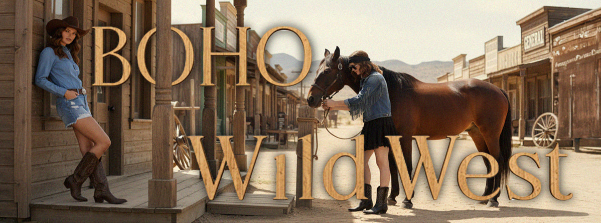 BOHO Wild West s’adresse à celles qui ont le pas sûr et le regard franc. Chapeaux cowboy, ceintures sculptées, bandanas, coupes plus affirmées, tout évoque les routes désertes, les saloons perdus et les nuits où l’on danse sur des caissons en oubliant l’heure.