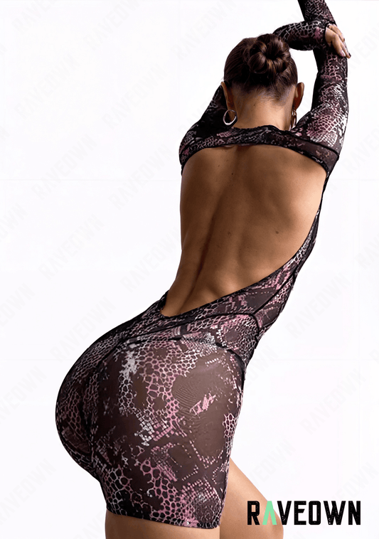 - Brassière zèbre, jupe fendue, gants longs, lunettes miroir.