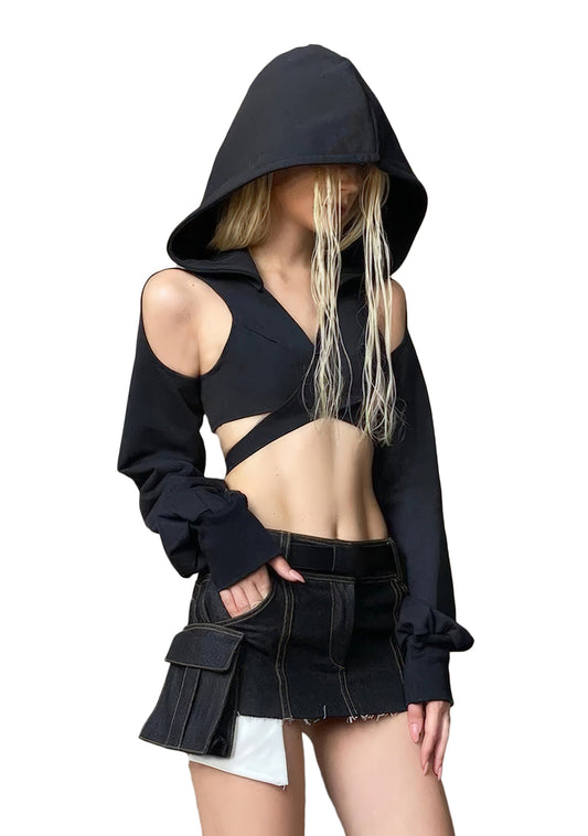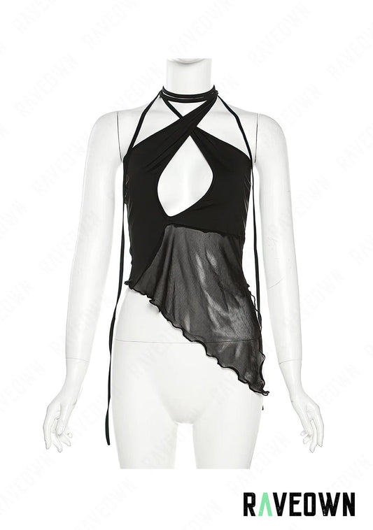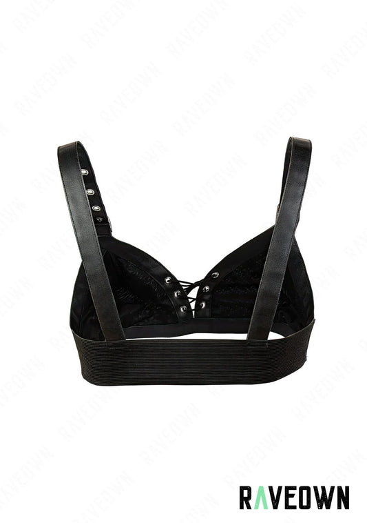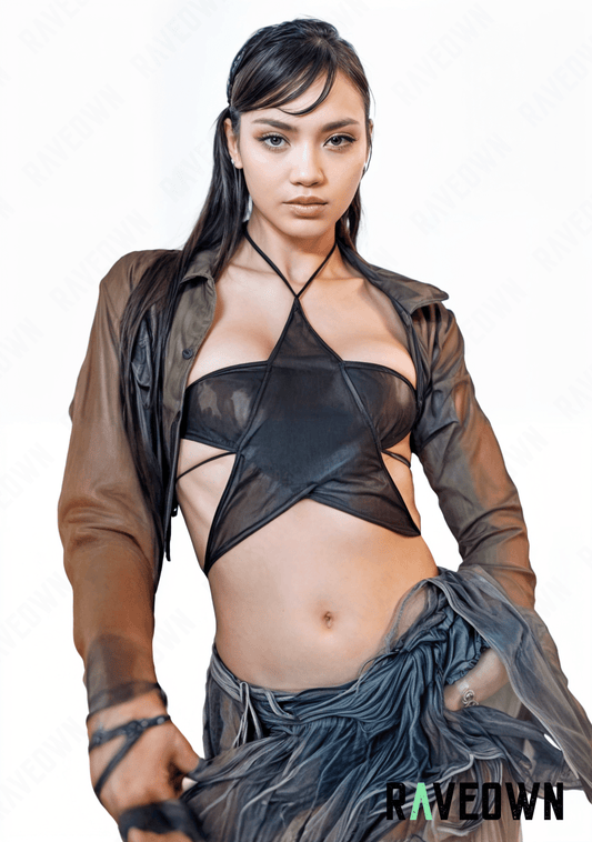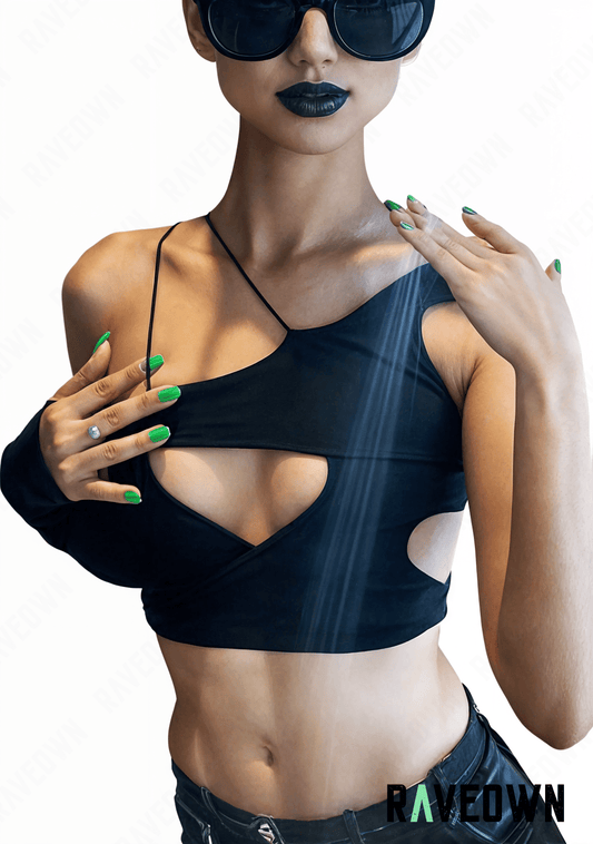 Le haut, c’est souvent la première arme. Ici, il se décline en crop top vinyle, bustier strappé, brassière mesh ou top asymétrique.